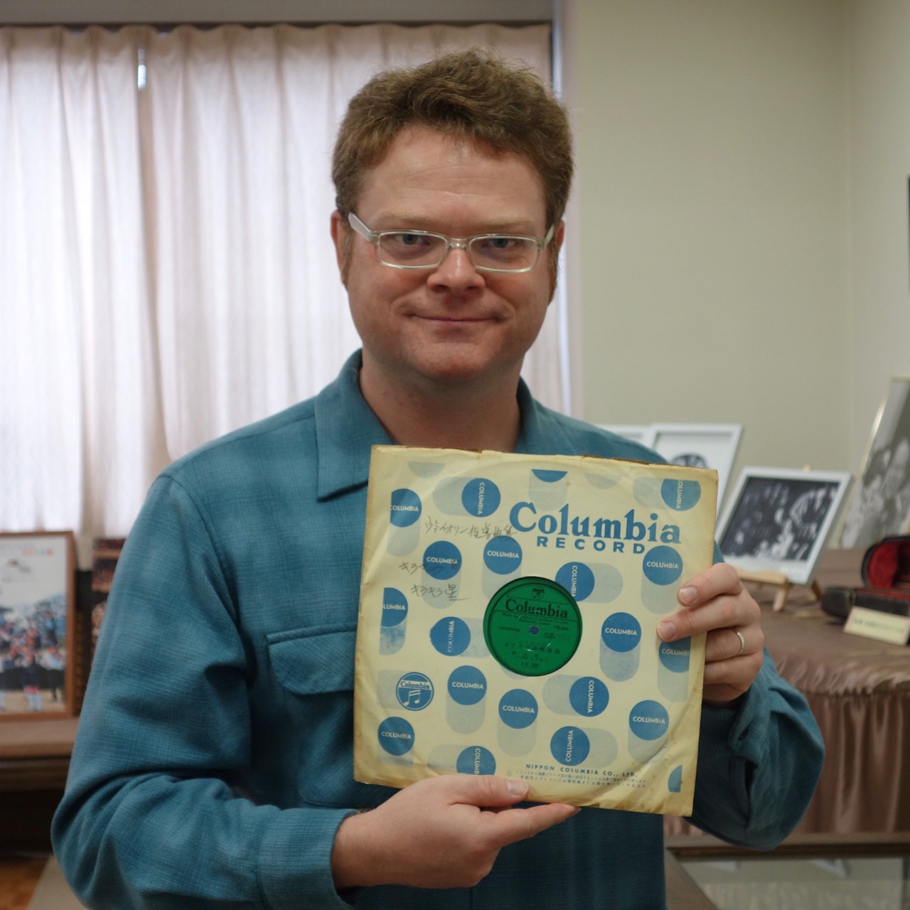 At the Suzuki Museum, holding Suzuki’s copy of the 78 recording of his Twinkle Variations