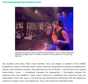 Last fall was the first time I got my students back out performing for the community, when members of my course Pedagogies of Improvisation in Music Learning went out to Hong Kong’s premier rock venue The Wanch. The sing-along was profiled in the online EdUHK magazine FLASS Forward, with some great quotes from the students.